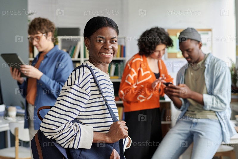 Портрет улыбающейся женщины, стоящей в современной офисной обстановке