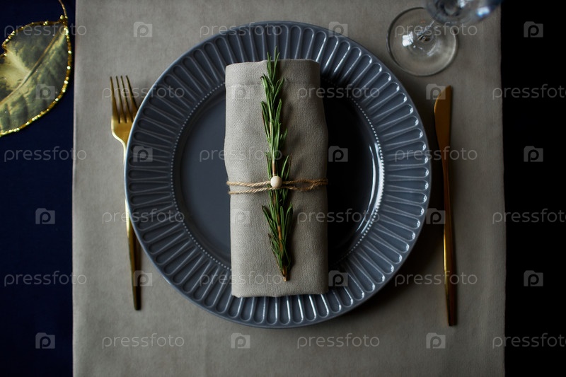 Столовая тарелка украшена льняной салфеткой в стиле ветвь ёлки на рождественском столе