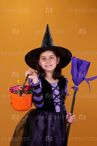 Милая маленькая ведьма в костюме на Хэллоуин