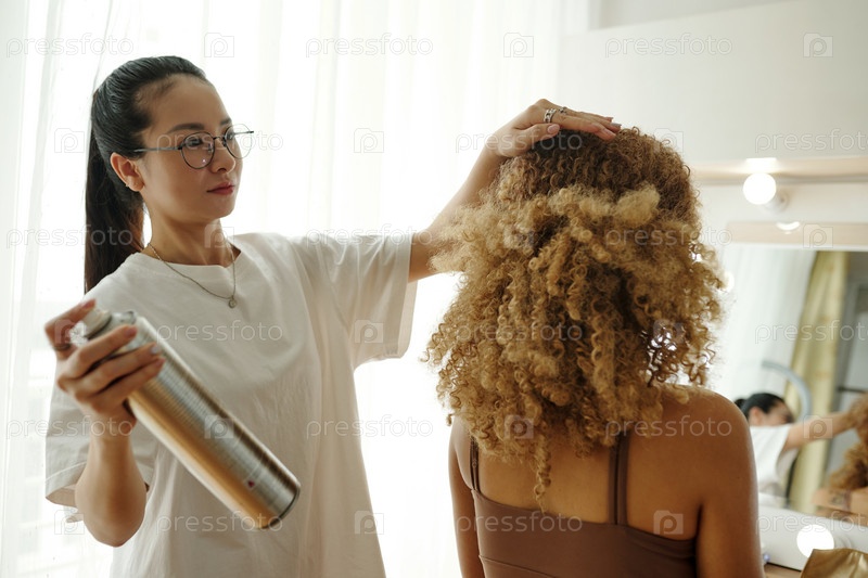 Стилист делает прическу для модели