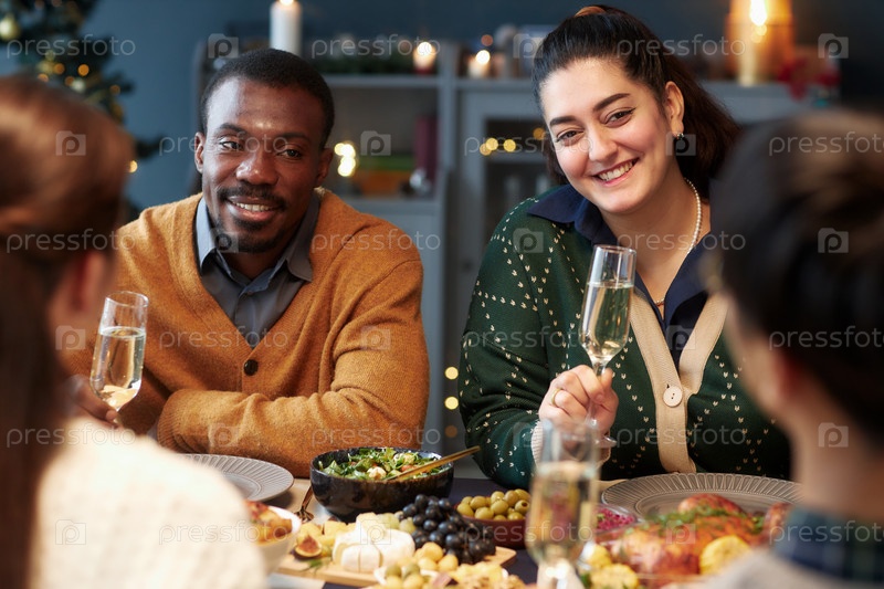 Женщина и чернокожий мужчина держат очки во время беседы с друзьями за столом в канун Рождества