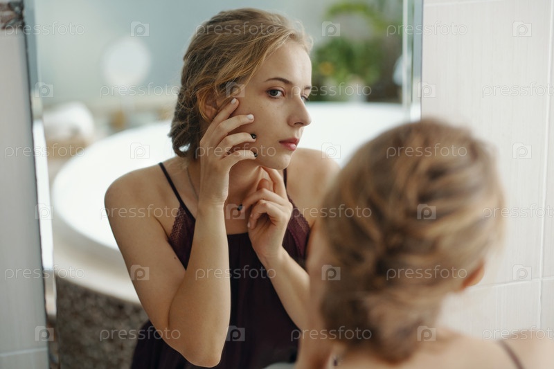 Проверка кожи в зеркале на наличие пятен и несовершенств