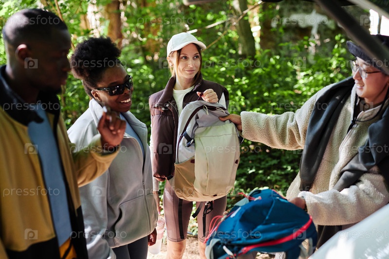 Туристы разгружают походные снаряжения из автомобиля