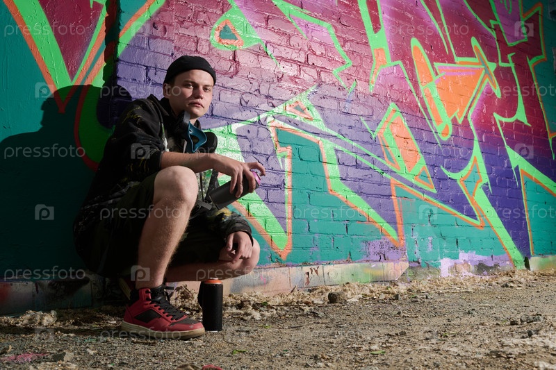 Опытный парень сидит у стены с произведениями искусства