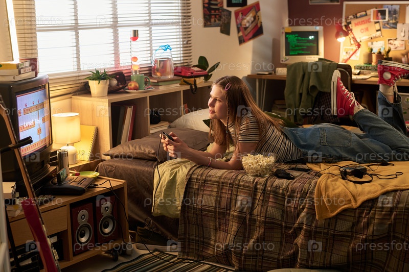 Молодая женщина отдыхает в уютной спальне, играя в видеоигры