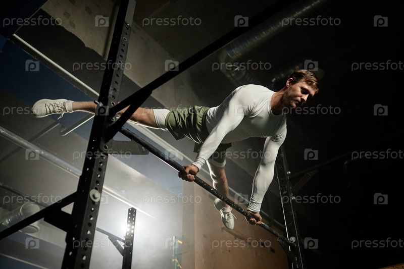 Сильный мужчина в пластинке Straddle на высоком баре Работает в тренажерном зале с низким ключевым освещением