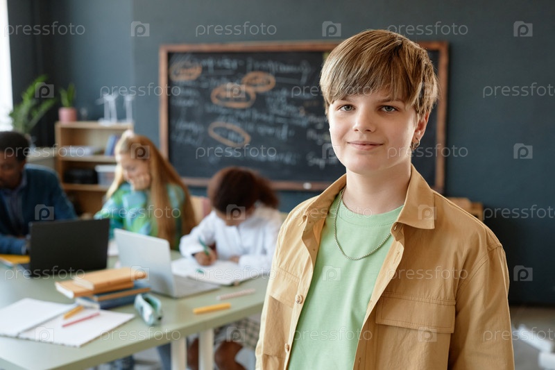 Мальчик-подросток стоит в классе с доской на заднем плане