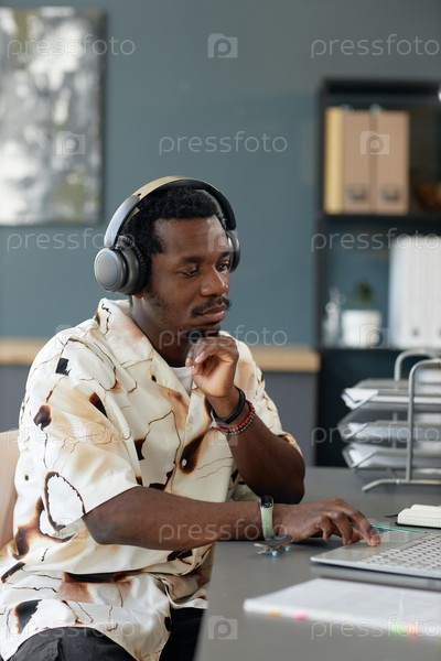 Чернокожий мужчина использует компьютер в наушниках, глядя на экран с скучным лицом