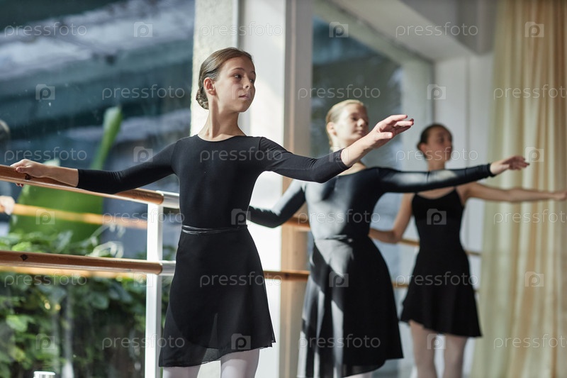 Молодая девушка в черном кроссовке поднимает руку Стоит на баре во время занятий балетом в танцевальной студии