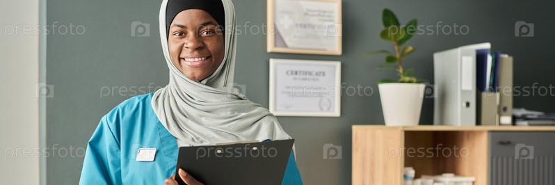Улыбающийся мусульманский медицинский профессионал, держащий Клипборд