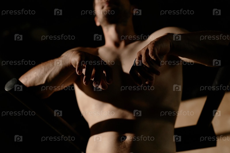 Руки мужчины без рубашки с оружием на параллельных барах во время тренировки в темно освещенном тренажерном зале