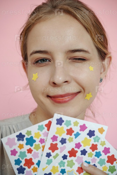 Женщина с подмигиванием, держащая наклейки в форме звезды на розовом фоне