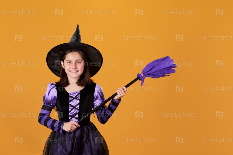 Ведьма, указывающая в сторону фиолетовой метлой
