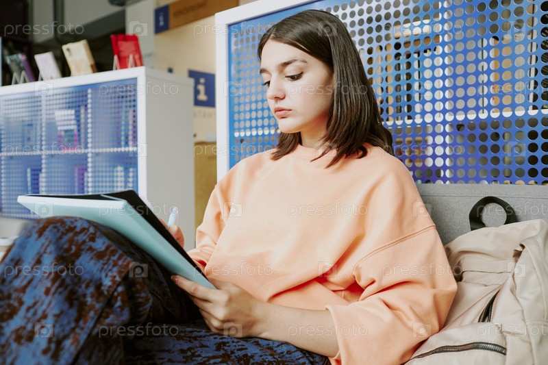 Концентрирующаяся женщина читает документ на современном диване