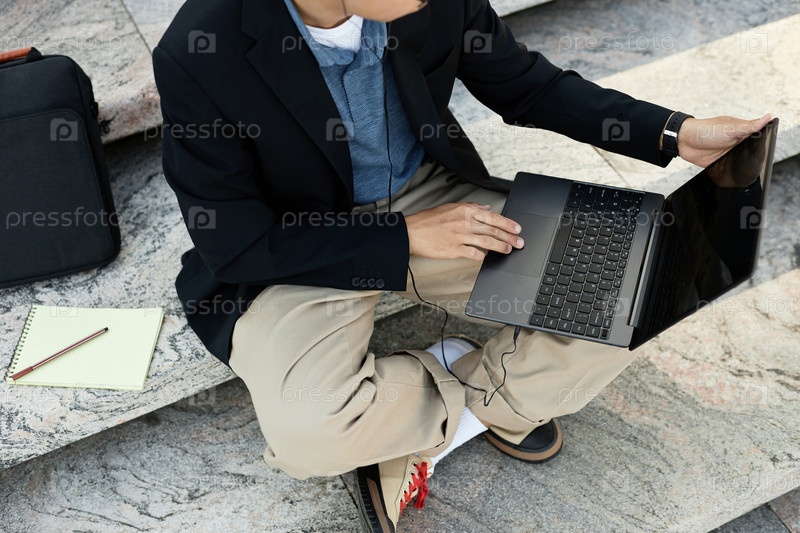 Разработчик программного обеспечения использует ноутбук с пальцами на сенсорной панели, сидя на ступеньках снаружи