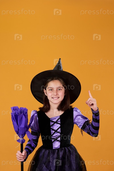 Милая веселая девушка в костюме ведьмы