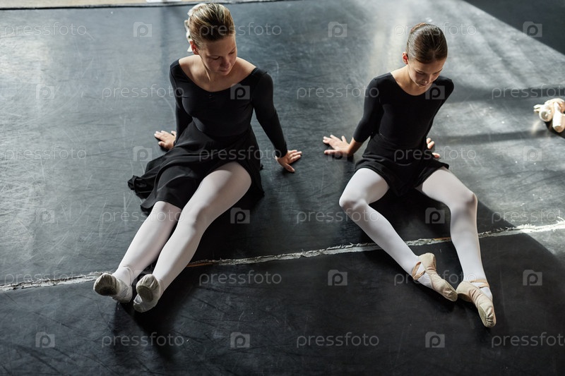 Две молодые балерины сидят на полу, растягивая ноги во время подготовки к занятиям в танцевальной студии