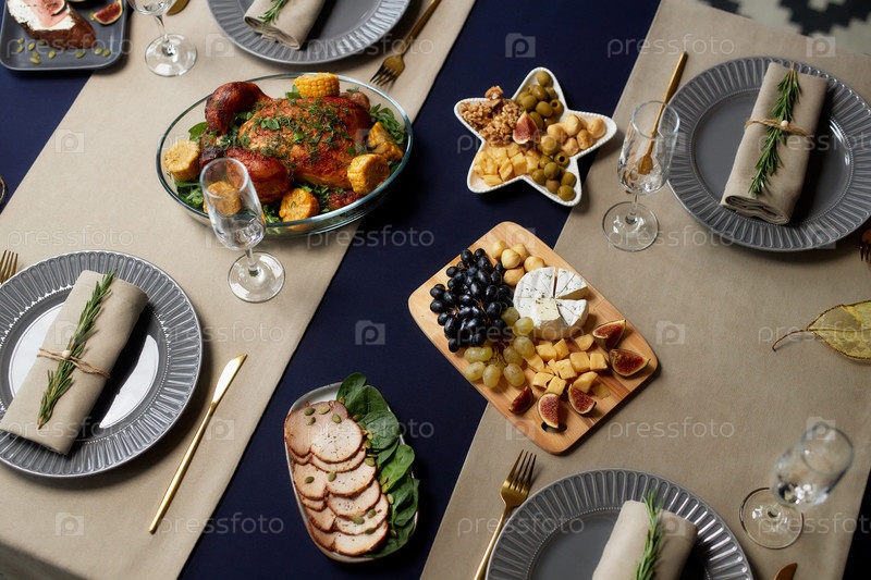 Фруктовая тарелка и жареное курица на столе с бокалами и блюдами на Рождество
