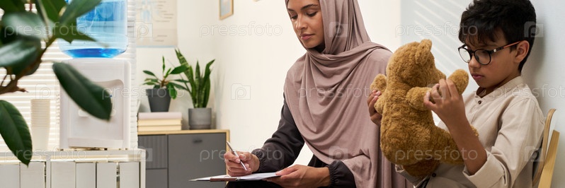 Наблюдение за ребенком, держащим медведя в комнате ожидания