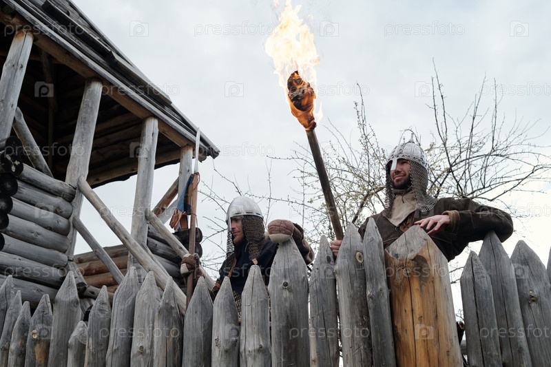 Охраняющий форт с горящим факелом и деревянным забором
