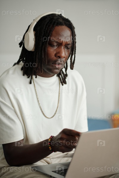 Фокусированный мужчина, использующий ноутбук с включенными наушниками