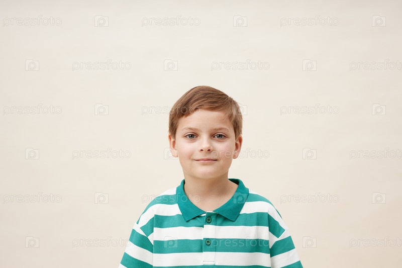 Портрет Блондинка в зеленом поло улыбается камере на бежевом фоне