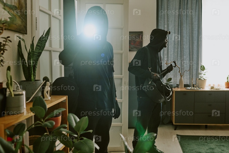 Два вора в черной одежде в квартире