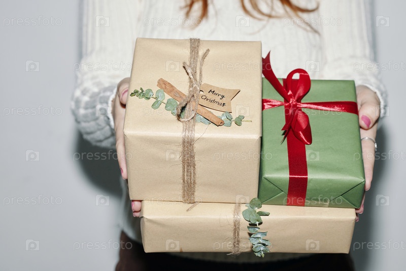Упакованные рождественские подарки с красной ленточкой, держащей лук