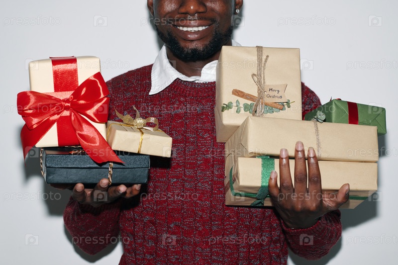 Улыбающийся мужчина держит массив красочных упакованных подарков