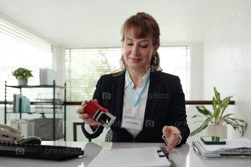 Социальный работник ставит штамп на заявку