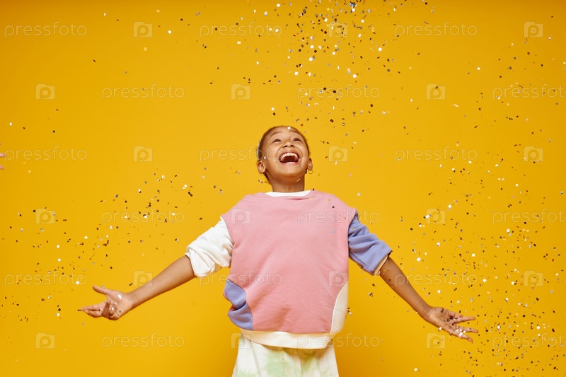 Молодая смеющаяся чернокожая девушка бросает конфетти в воздух, стоя на оранжевой студии