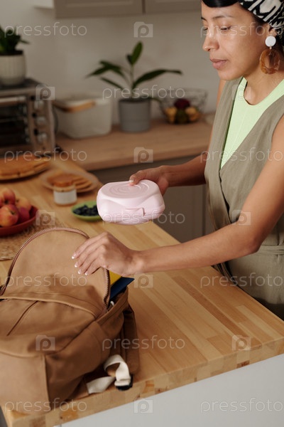 Молодая испаноязычная женщина упаковывает обед на кухне