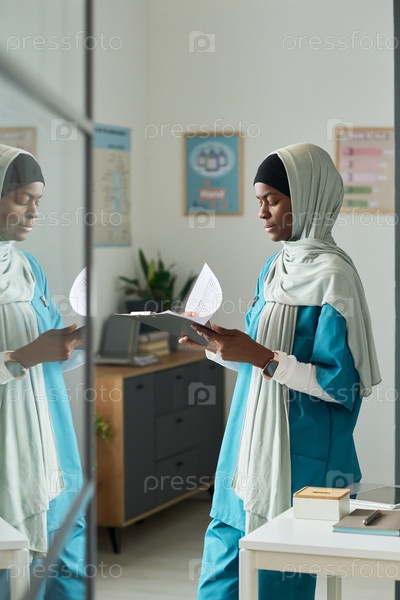 Фокусированный мусульманский медицинский профессионал, рассматривающий документы