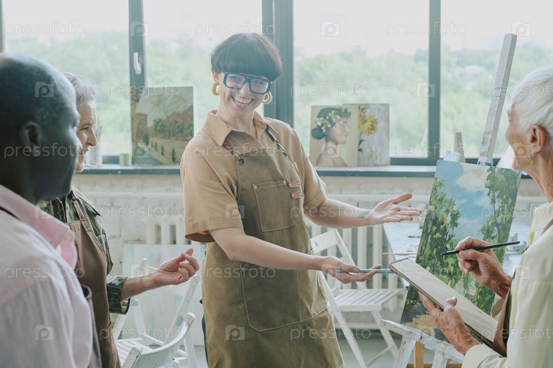 Гордый улыбающийся учитель демонстрирует собственное произведение искусства
