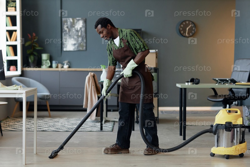Черный человек в службе уборки и пылесосов на полу дома или офиса