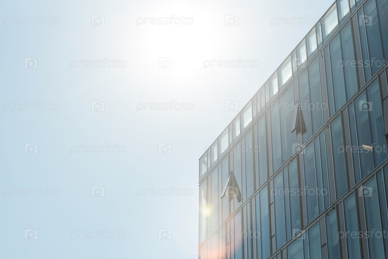Фасад здания с открытыми окнами против голубого неба в городском стекле