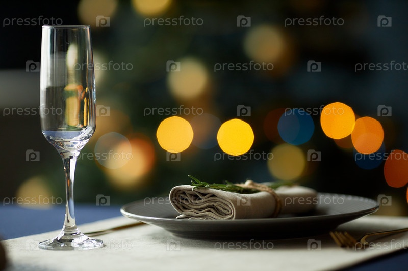 Рождественский стол, подаваемый со стеклом и салфеткой с розмариновой ветвью ёлки на тарелке