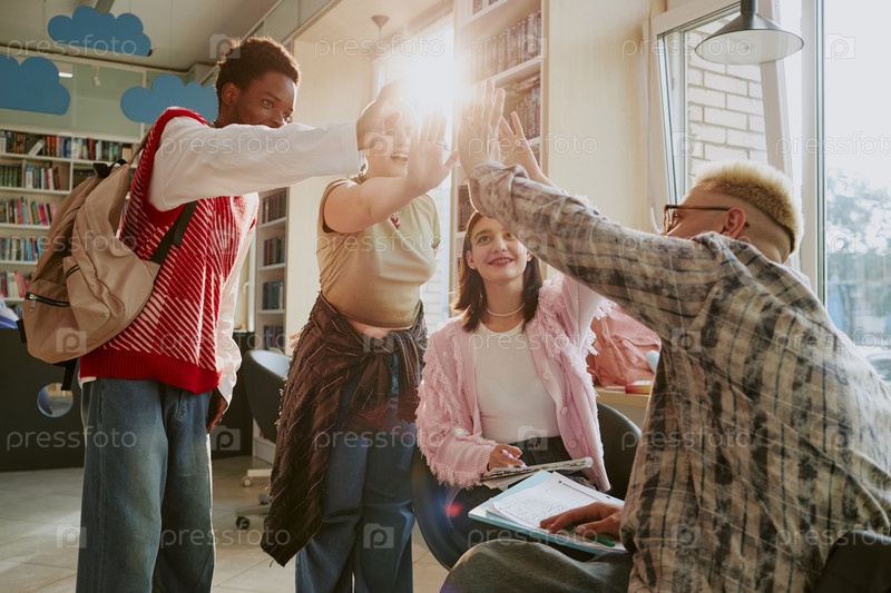 Отпразднование успеха команды High Five в Bright Cafe Setting