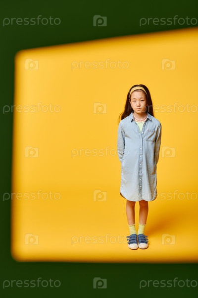 Уверенная девушка-подросток в рубашке и платье стоит на жёлтом фоне в студии