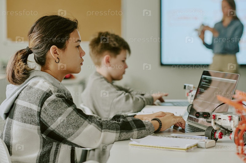 Школьная девочка кодирует на рабочем столе