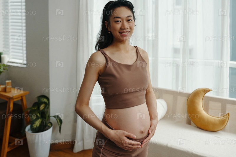 Улыбающаяся беременная женщина касается своего живота дома