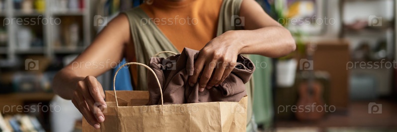 Shop assistant packing purchase in bag Помощник по упаковке покупки в мешке