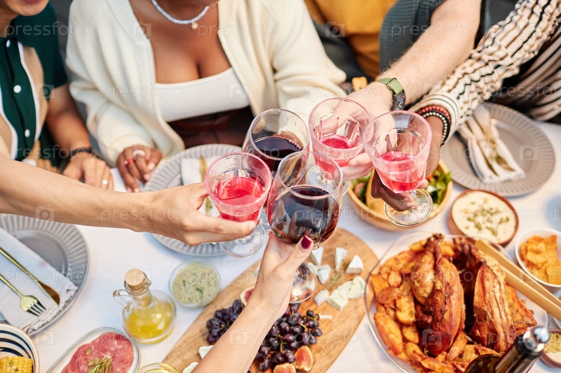 Друзья, стучащие бокалы с вином, наслаждающиеся напитками