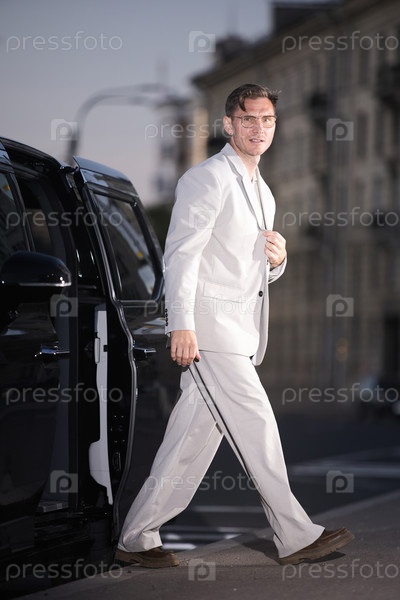 Знаменитость в белом костюме ходит по городской улице прибывает на машине на мероприятии Мужчина