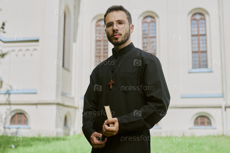 Молодой священник рядом с церковью