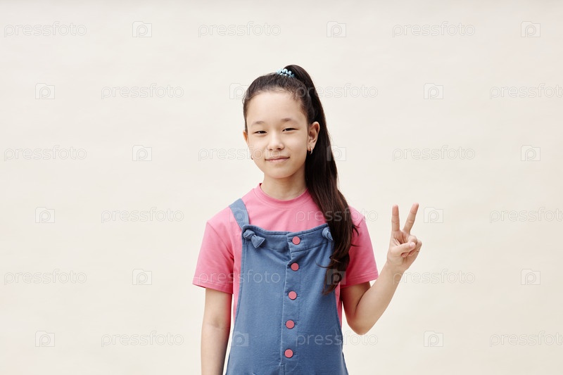 Портрет женского азиатского ребенка, улыбающегося и показывающего знак 'V', стоящего в студии