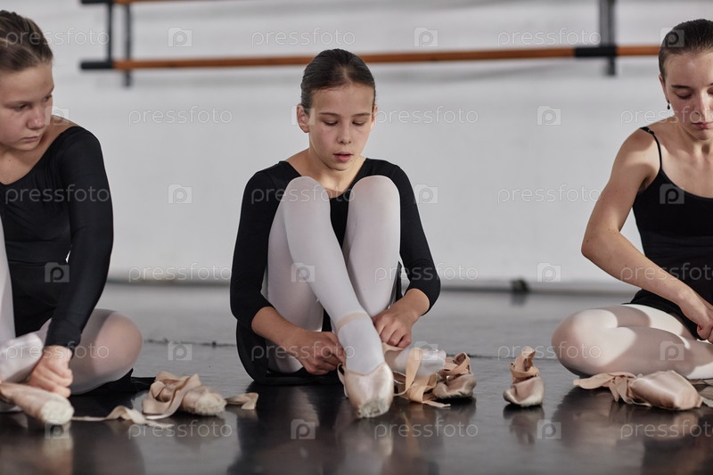 Молодая балерина завязывает танцевальные туфли, сидя на полу во время урока балета для детей