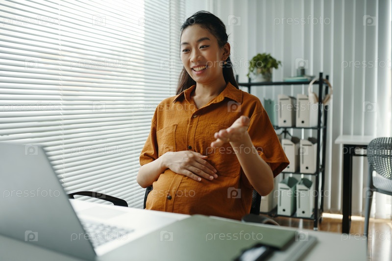 Счастливая беременная женщина участвует в видеоконференцсвязи