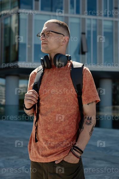 Человек в очках, носящий рюкзак и повседневную одежду стоит на улице