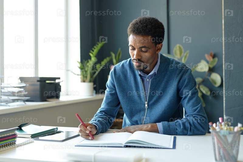 Чернокожий учитель-мужчина за столом в классе делает записки